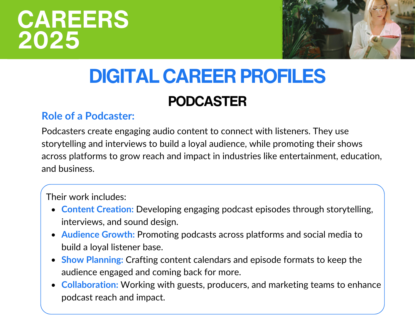 - Digital Career Profiles: Explore five dynamic digital career profiles that showcase the variety of roles in the tech-driven world. Each profile offers insights into key responsibilities, essential skills, and how these careers shape innovation, communication, and the digital landscape.