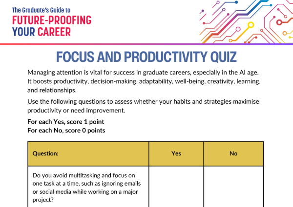 In a world of endless distractions, mastering your attention boosts productivity, creativity, and well-being – making it one of the most valuable career skills you can develop. Inspired by Paul Redmond’s The Graduate’s Guide to Future-Proofing Your Career, this quick Focus and Attention Quiz is your key to thriving in the AI age.