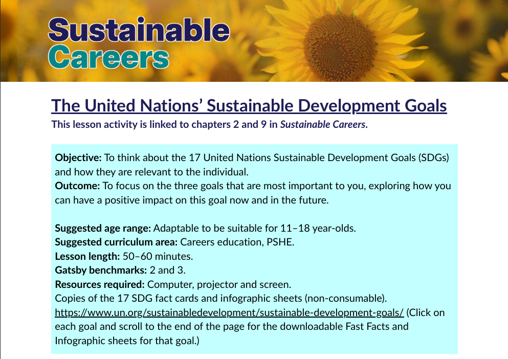 - The United Nation Sustainable Development Goals. Objective: To think about the 17 United Nations Sustainable Development Goals (SDGs) and how they are relevant to the individual. *Additional worksheet to download!